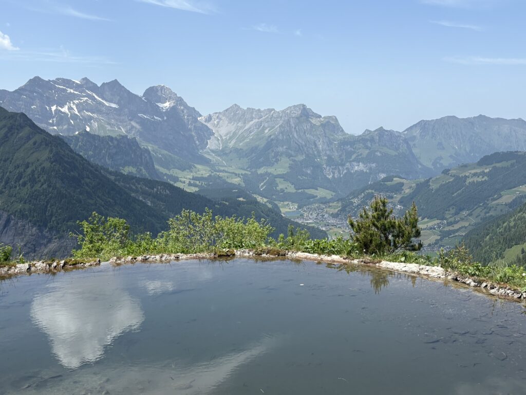 A little further on, as the trail curves around the “Hundschuft,” you’ll find another peaceful lake. This one with sweeping views all the way down to Engelberg. On a clear day, the water seems to melt into the sky. There’s something incredibly calming about the openness here, especially after the more intimate feeling of Spiegelseeli.