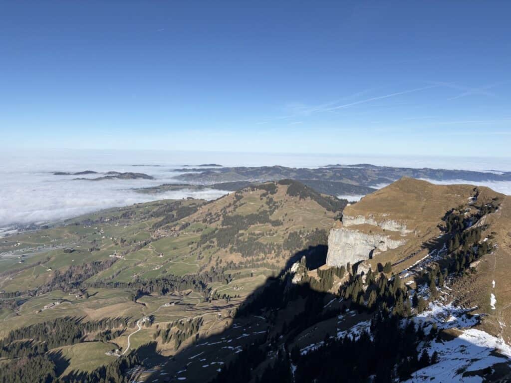 Perched high above the Alpstein, Hoher Kasten has been around forever — yet somehow I hadn’t visited in years. Big mistake. Just about 2.5 hours from Zurich by public transport, this mountain is a reliable sun magnet when the lowlands are drowning in fog. Thanks to its exposed summit plateau, the views are spectacular in every direction. At the top, an easy circular trail makes it simple to enjoy the panorama without needing serious hiking experience — though in summer and autumn, there are plenty of longer routes for more adventurous visitors.