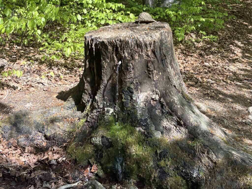 Not long after, the trail leads into a short forest section. Right at the entrance, there’s another fireplace. What I liked most here though was the little fountain hidden in a tree trunk. I stopped there to refill my water bottle.